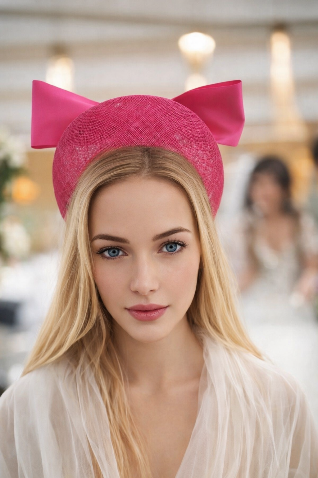 Add a touch of elegance to your outfit with this beautiful fascinator. The headpiece features a charming bow accent with tails on a sinamay halo base.