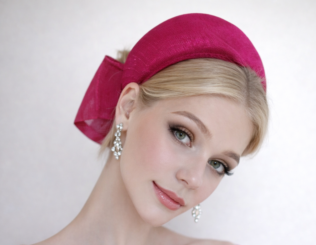 Presenting a beautiful pink sinamay fascinator headband with a large bow on the back. This is a stand out design and aimed to make an impact. Created using traditional millinery techniques this is a surprisingly lightweight headpiece as it is hollow inside.