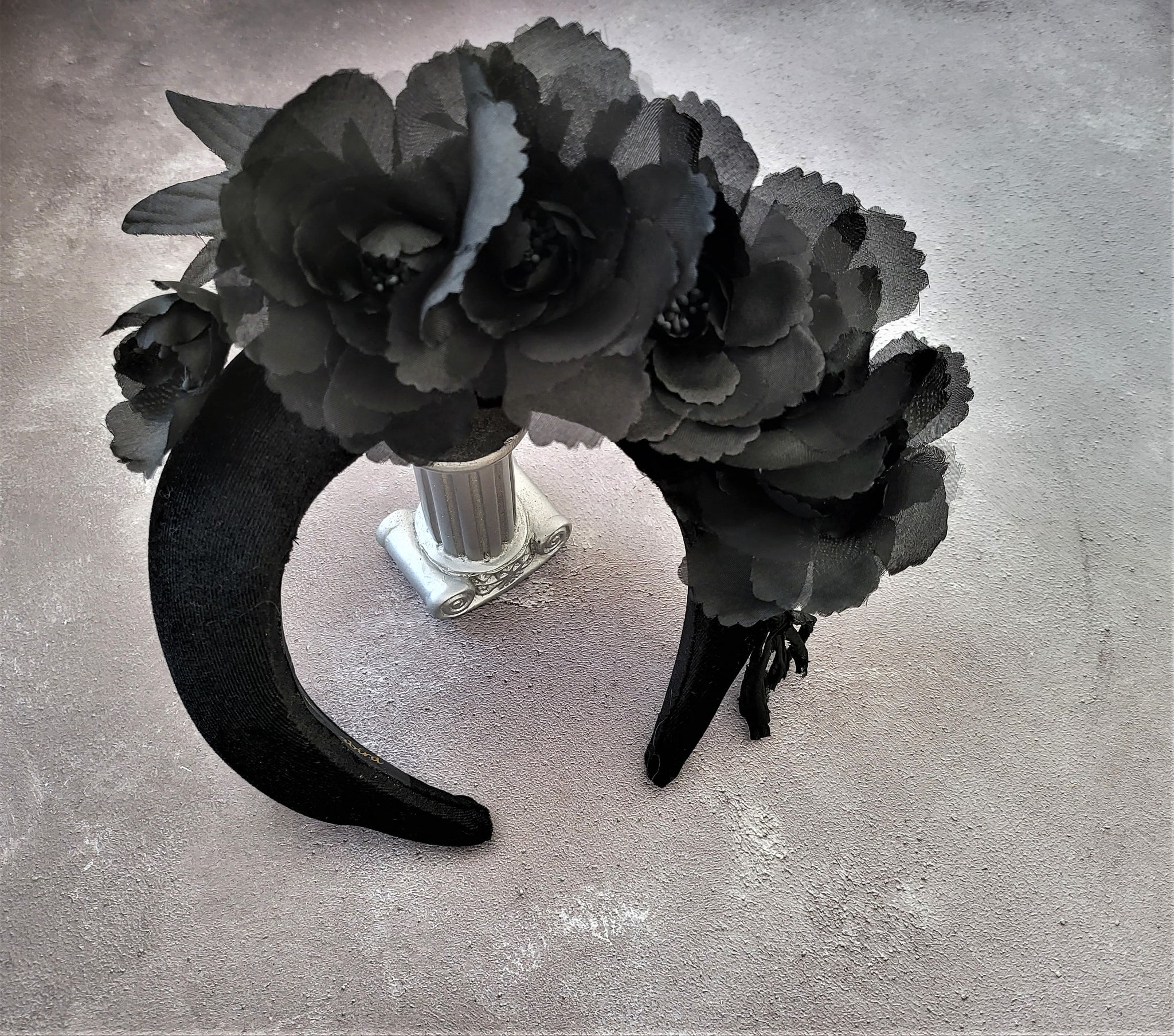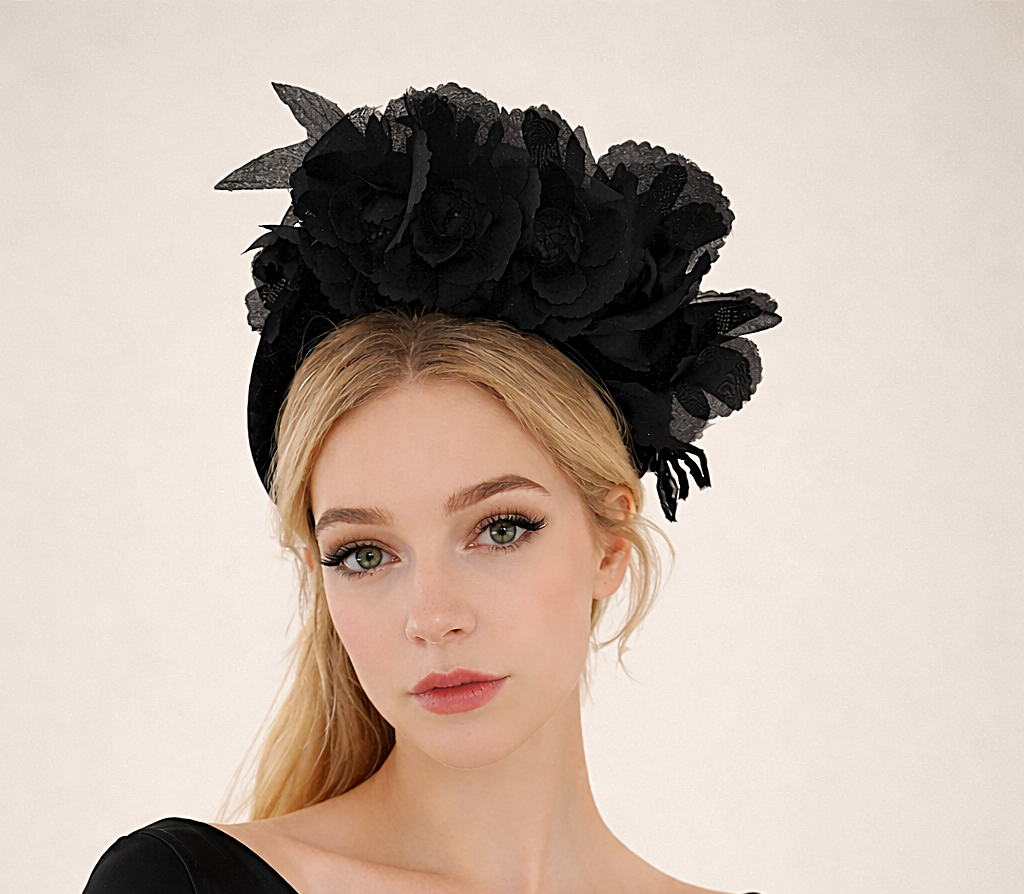 The 4 cm wide halo base is softly padded for structure and comfort. It is finished with a sculpted black organza silk chiffon flower vine that rises above the headband, lightly wired so the flowers can be adjusted to suit your chosen hairstyle.