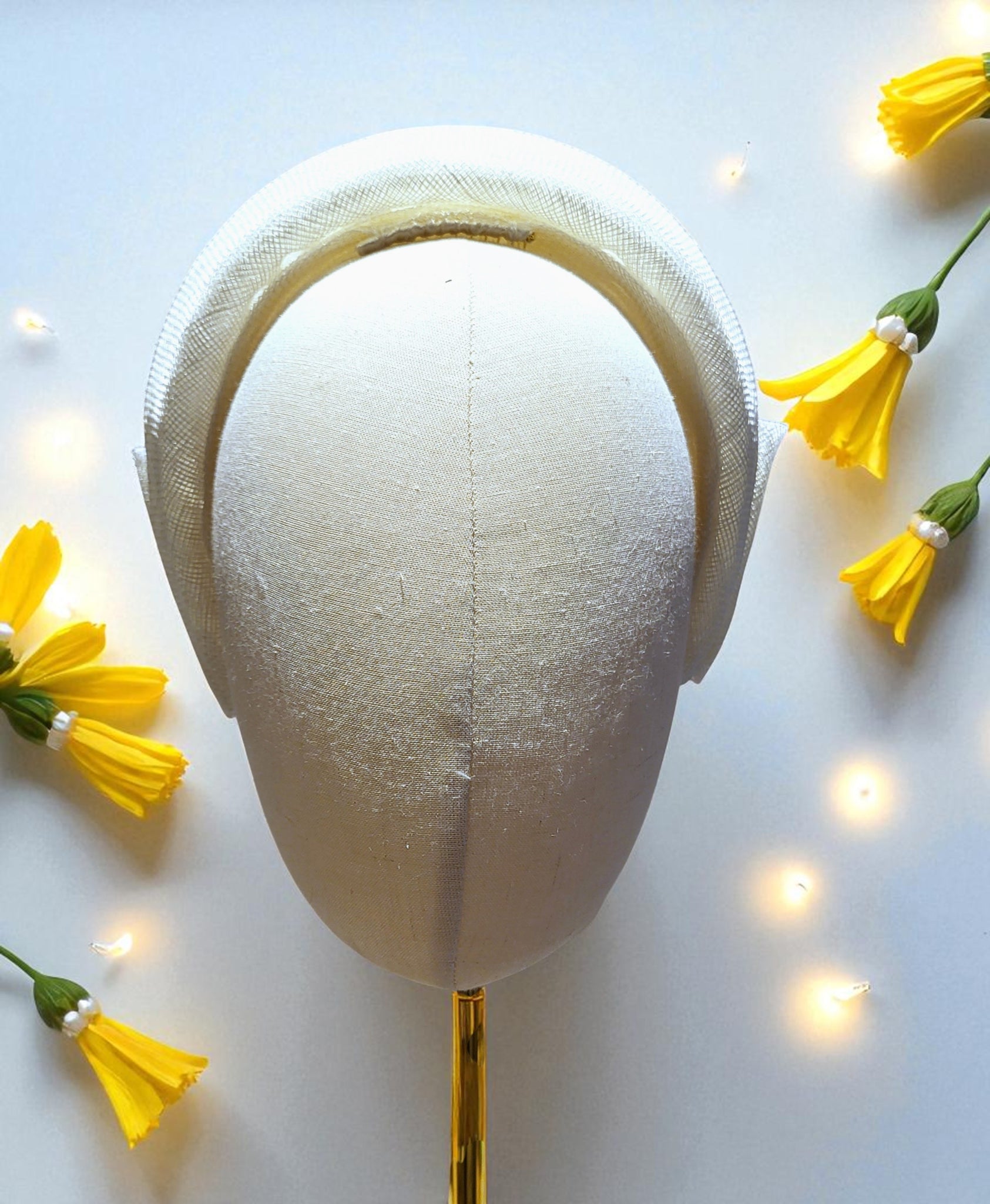 Handmade from sinamay straw the bow is attached and measures approximately 8.5 cm in height.
