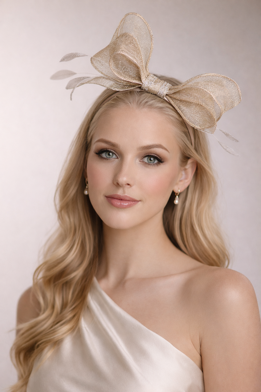 The sculptural bow is crafted from sinamay woven with subtle silver lurex thread, creating a soft shimmer as it catches the light. Coordinating feathers introduce gentle movement and balance, resulting in a classic millinery silhouette that complements both contemporary and traditional outfits.